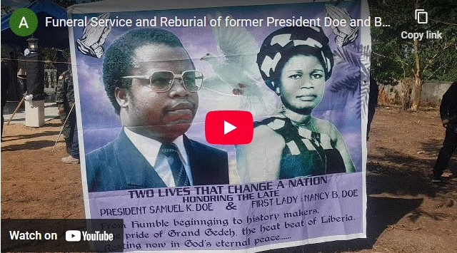 Speaking at the State Funeral Service and Reburial of former President Samuel Kanyon Doe and Burial of former First Lady Nancy Bohn Doe, the President passionately appealed to every Liberian to also reject bitterness and that Liberians should “walk forward with hope, guided by love for our country and faith in our shared destiny.”