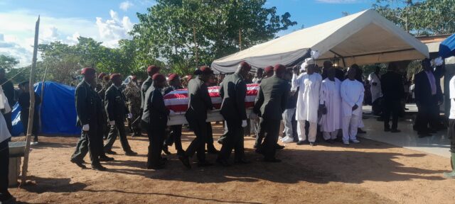 The flags covering each coffin were militarily folded by the Armed Forces of Liberia soldiers and handed to the Doe Family. The late former President was honored with military 21-gun salute.